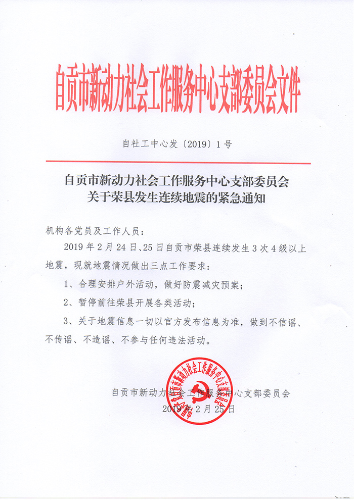 自贡市新动力社会工作服务中心支部委员会关于荣县发生连续地震的紧急通知