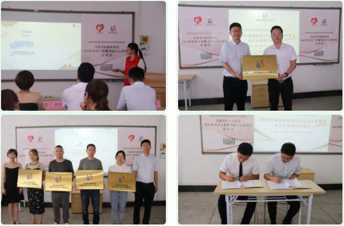 首先由新动力社工负责人向与会人员介绍本次新街街道2022年社会工作服务试点示范项目的具体内容,帮助各方了解项目情况。随后由市民政局副局长黄艳峰向新街街道党工委书记何嘉街授社工站标牌;区民政局局长梁炜雪、街道党工委书记何嘉向四个社区授社区社工室标牌,代表社区社工室正式成立,在今后自流井区的社工站室场景中,对“中国社会工作”及“自流井社工”进行双标识呈现。