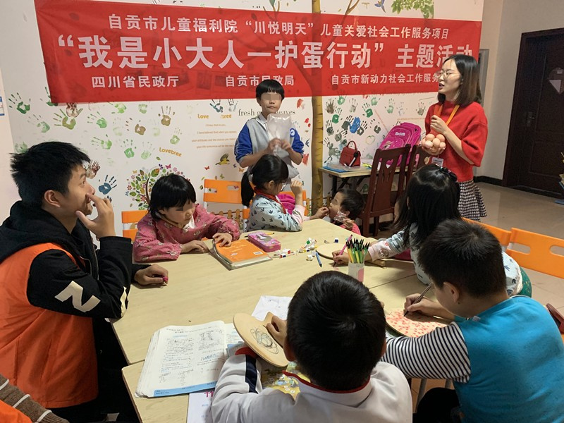 为了让孩子们感受生命的珍贵、珍爱生命,明确自己的责任,培养责任意识,提高责任感。2019年10月28日-11月1日,新动力社工在自贡市儿童福利院社工加油站开展了“我是小大人——护蛋行动”主题活动。本次活动共13名儿童参与。