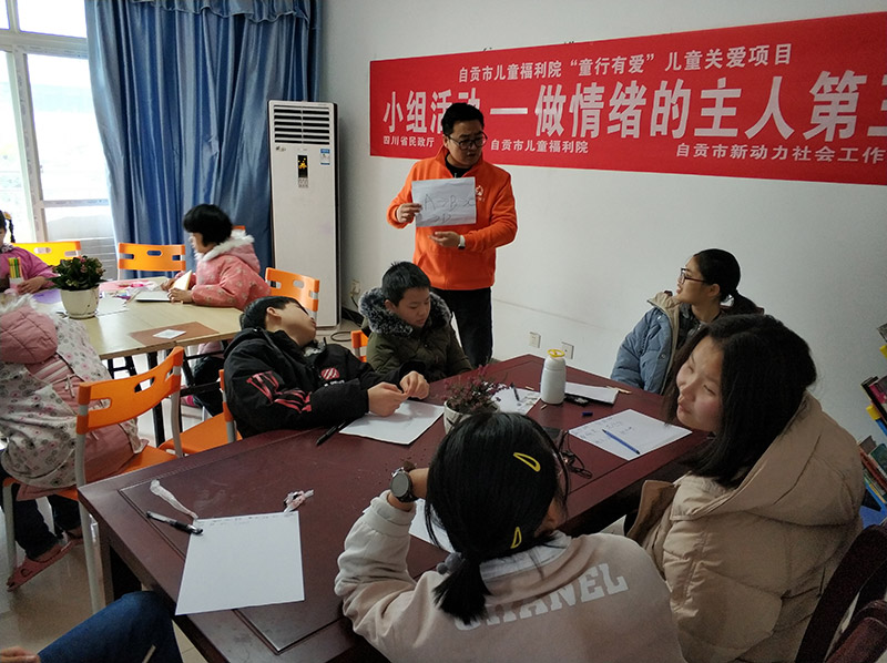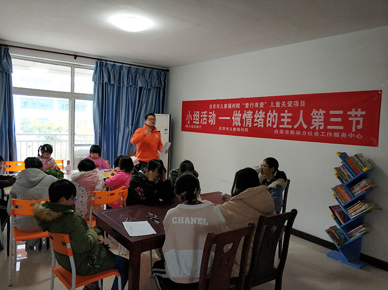 2019年3月2日,自贡市新动力社会工作服务中心2018四川省省财A3项目组社工组织13名自贡市儿童福利院孩子在福利院“童行有爱”加油站,开展了“做情绪的主人”——第三节小组活动。