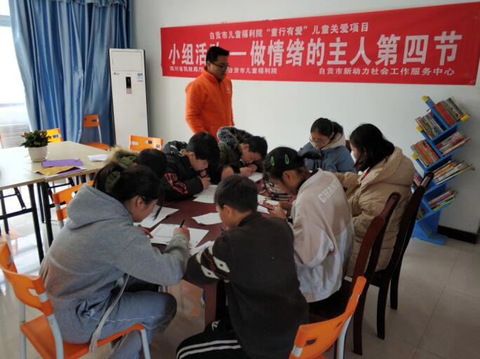 2019年3月3日,自贡市新动力社会工作服务中心2018四川省省财A3项目组社工组织8名自贡市儿童福利院孩子在福利院“童行有爱”加油站,开展了“做情绪的主人”——第四节小组活动。