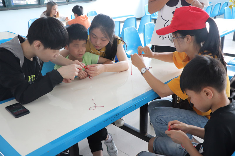 DIY环节,孩子们在四川轻化工大学同心圆志愿服务队的大哥哥、大姐姐的带领下,完成了手环的编制,并相互赠送寄托着美好祝福的红手环。在场的社工哥哥姐姐们也收到了孩子们礼物。