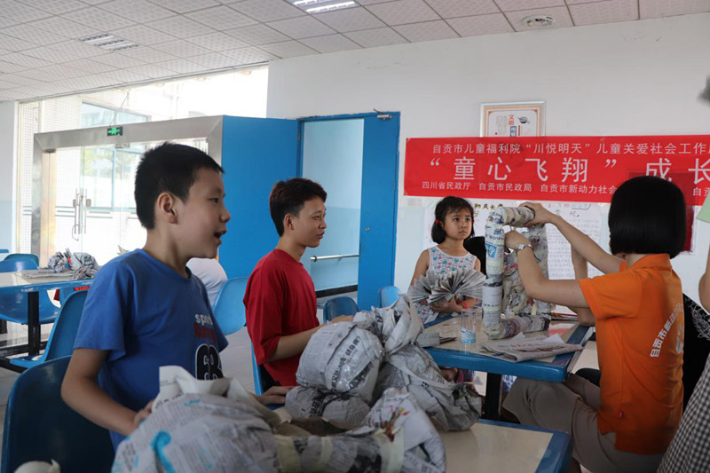 为加强自贡市儿童福利院在外读书儿童与在院儿童之间的情感联系,让儿童学会团结,不断成长,并丰富其假期生活,2019年8月12日至16日,新动力社工在自贡市儿童福利院组织了为期5天的“童心飞翔”成长营,本次成长营共服务儿童77人次。