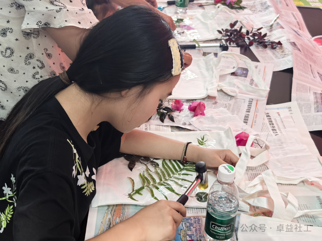 活动内容包括“植物拓印相关知识学习”“现场制作植物拓印帆布包”“作品分享”三部分。首先,儿童在社工带领下,摘取自己喜欢的植物放入明矾水中浸泡10分钟,同时,社工通过PPT,带领儿童了解植物拓印的历史起源、制作过程及文化意义等,并进行了植物拓印优秀作品欣赏;在学习完制作步骤后,在社工及志愿者的帮助下,按照制作流程,孩子们挑选出植物放在帆布包上拼出有趣的图案,用透明胶带盖住,并反复进行敲打。在一声声的敲打声中,一幅幅充满创造力的作品呈现在眼前。最后,孩子们纷纷展示出自己的拓印作品,并表示很喜欢参与这种活动。