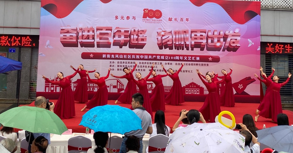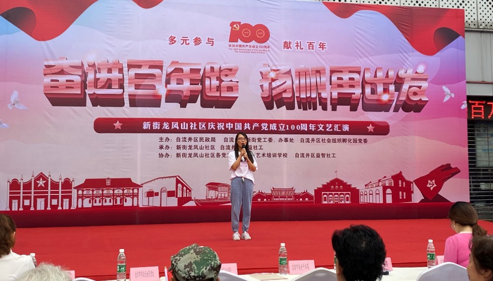 2021年6月25号,由自流井区民政局,自流区新街党工委、办事处,自流井区社会组织孵化园主办,龙凤山社区、自流井区卓益社工承办的“多元参与·献礼百年”——“百年奋进路·扬帆再出发”新街龙凤山社区庆祝建党100周年文艺汇演在社区举行。自流井区退役军人事务局、华西能源、解放路中学等9家驻区单位以及160余名社区居民参与了本次活动。