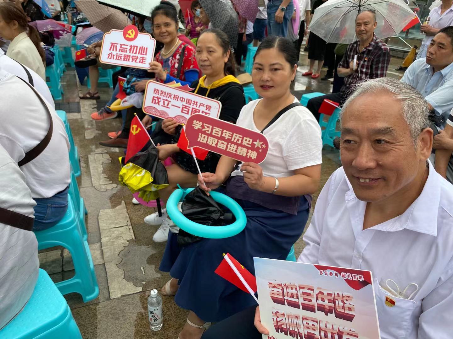 为热烈庆祝中国共产党成立100周年,龙凤山社区与卓益社工依托龙凤山社区“睦邻花开”社会工作服务项目组织了本次活动。卓益社工在龙凤山社区的大力支持下,进行了党员拜访、社区社会组织邀请、企事业单位邀请,并组织、参与了四次社区内各党支部讨论会议,通过线上线下的方式共同决定了活动的主题、节目内容等,并筛选确定了来自社区社会组织、辖区单位、社区党员的文艺节目10个,包括舞蹈、小品、歌曲表演等,共同为建党百年献礼。经过大家一个多月的精心准备,节目有了精彩的呈现,虽然天空一直小雨不断,活动也有所推迟,但大家的为党献礼的热情依然高昂,整场活动在《没有共产党就没有新中国》的大合唱中结束。正如自流井区民政局机关党委书记傅娅梅在活动发言中讲到的“在中国共产党的领导下,社区居民的生活,有了很大的改观和变化,生活越来越好,越来越幸福。”