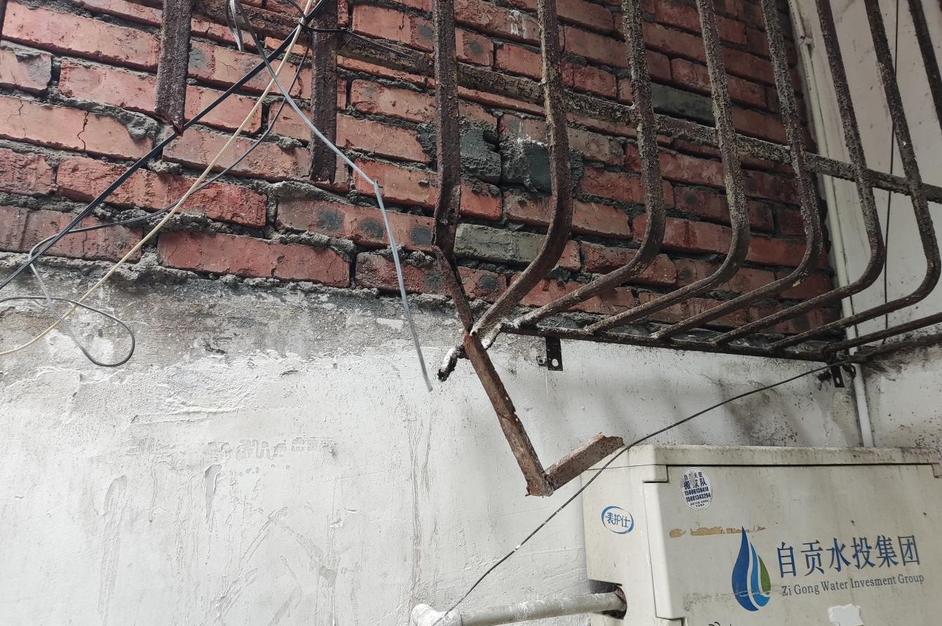 行人过道上冒出的生锈栏杆