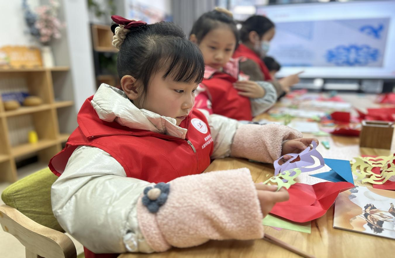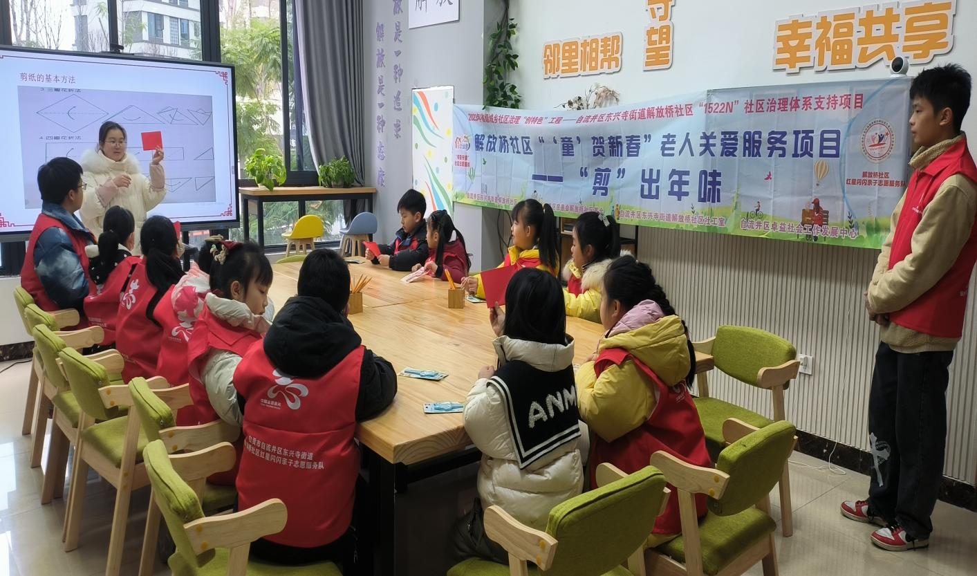 2024年1月29日,解放桥社区红星闪闪亲子志愿服务队在解放桥社区邻里客厅开展了“‘童’贺新春”老年关爱服务项目“剪出年味”儿童剪纸活动,社区13名儿童参与。